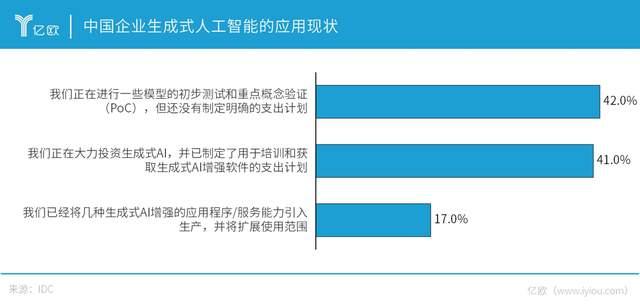 从调研数据来看,42%的中国企业中国企业已经开始进行大模型的初步测试和重点概念验证,41%的企业正在大力投资生成式AI,并已制定了用于培训和获取生成时AI增强软件的支出计划,说明当前中国企业在生成时AI的投入上正在逐步扩张。但能够将技术引入生产阶段并用于实际业务中的企业进展17%,说明中国企业仍需进一步探索有价值的应用。